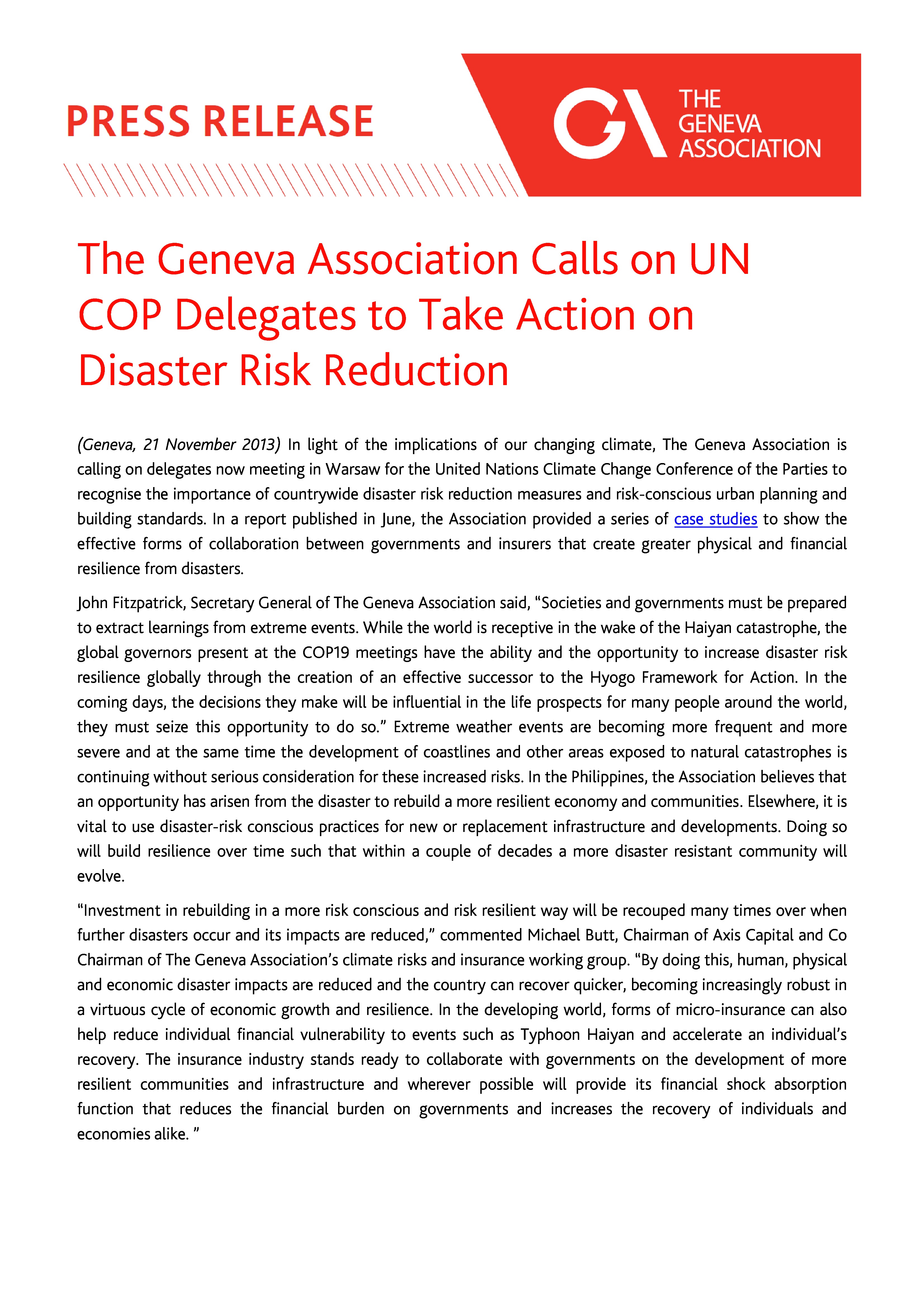 In light of the implications of our changing climate, The Geneva Association is calling on delegates now meeting in Warsaw for the United Nations Climate Change Conference of the Parties to recognise the importance of countrywide disaster risk reduction measures and risk-conscious urban planning and building standards. In a report published in June, the Association provided a series of case studies to show the effective forms of collaboration between governments and insurers that create greater physical and financial resilience from disasters.
