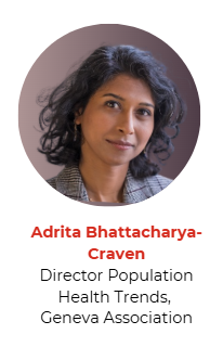 Adrita Bhattacharya-Craven is the Director Population Health Trends at the Geneva Association. Her work at the GA focuses on the strategic and long-term research priorities of health and life insurers and is undertaken in collaboration with experts and executives from GA member companies, academic institutions as well as global or-ganisations. Her work reflects the growing convergence of life and health insurance, against the backdrop of an emerging risk landscape brought about by new disease patterns, ageing, technology and other market disruptors that are central considerations for improving consumer access to risk protection and business sustainability. Prior to joining the GA, Adrita worked extensively in global health across the public and private sectors, as well as with global bilateral and multilateral organisations, specialising in the strategic purchasing of healthcare and health market analysis. She also closely supported several high-level health financing interventions internationally.