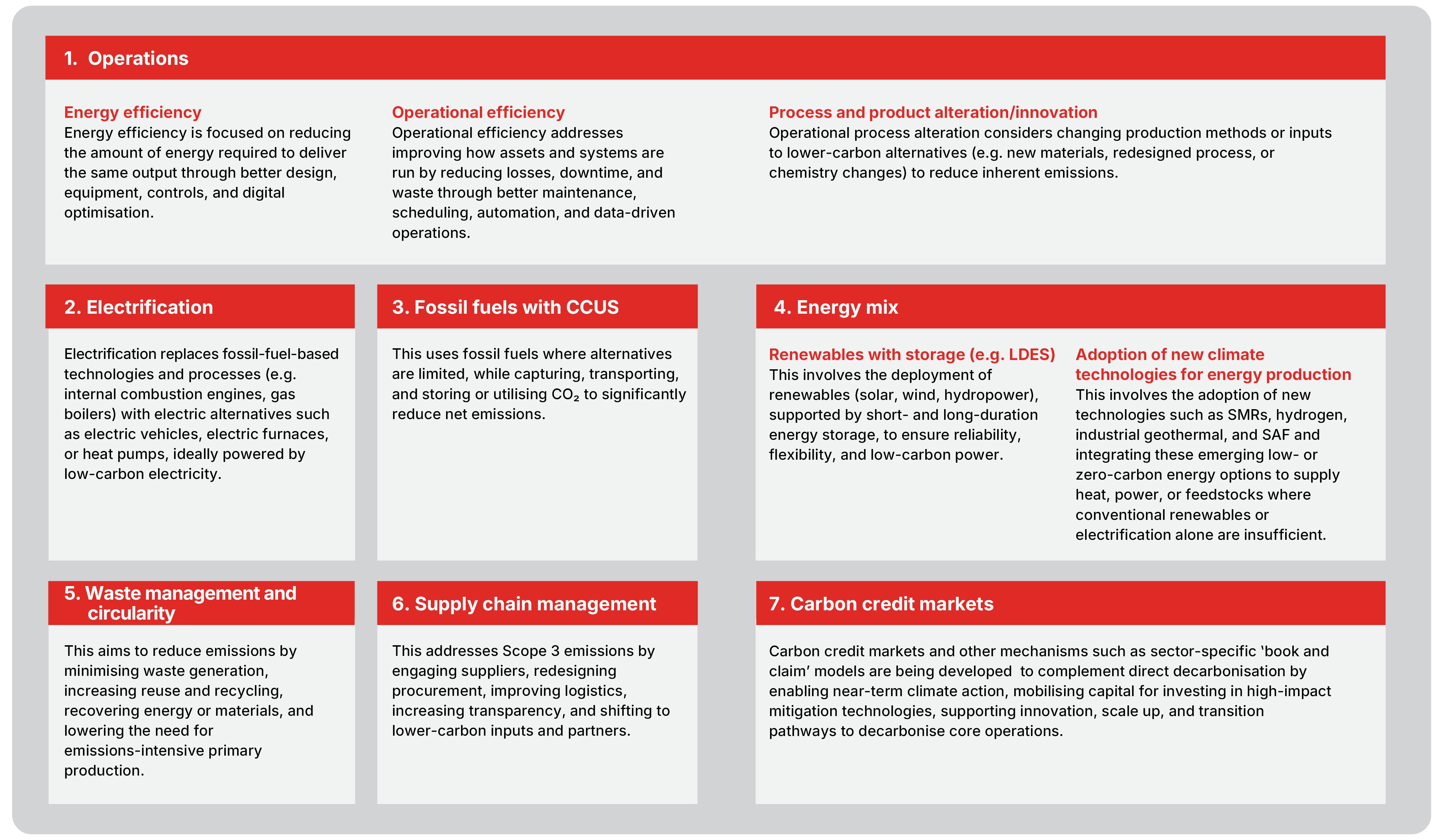 These include energy and operational efficiencies and alterations, electrification, reliance on fossil fuels combined with CCUS, an energy mix combining a range of low- or zero-carbon energy production options, waste management and circularity, supply chain management, and utilising carbon credit markets or similar sector-specific schemes to mobilise capital.
