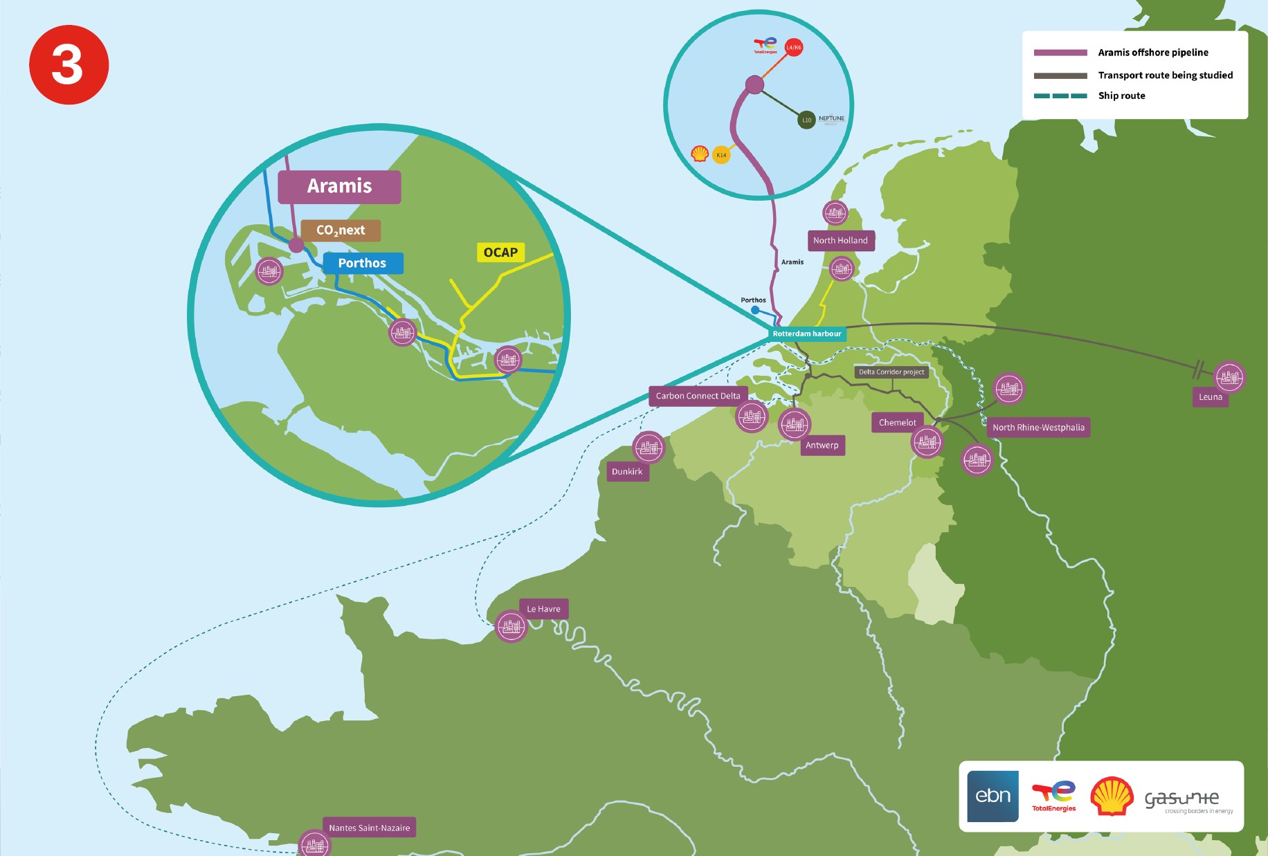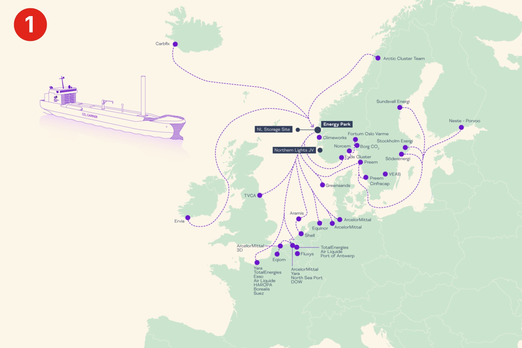 Northern Lights – an open and flexible CCS infrastructure that aims to transport CO2 by ship from capture sites across Europe (purple dots) to a terminal in Norway for intermediate storage, before transporting it for permanent storage in a reservoir under the seabed (operational in 2025).