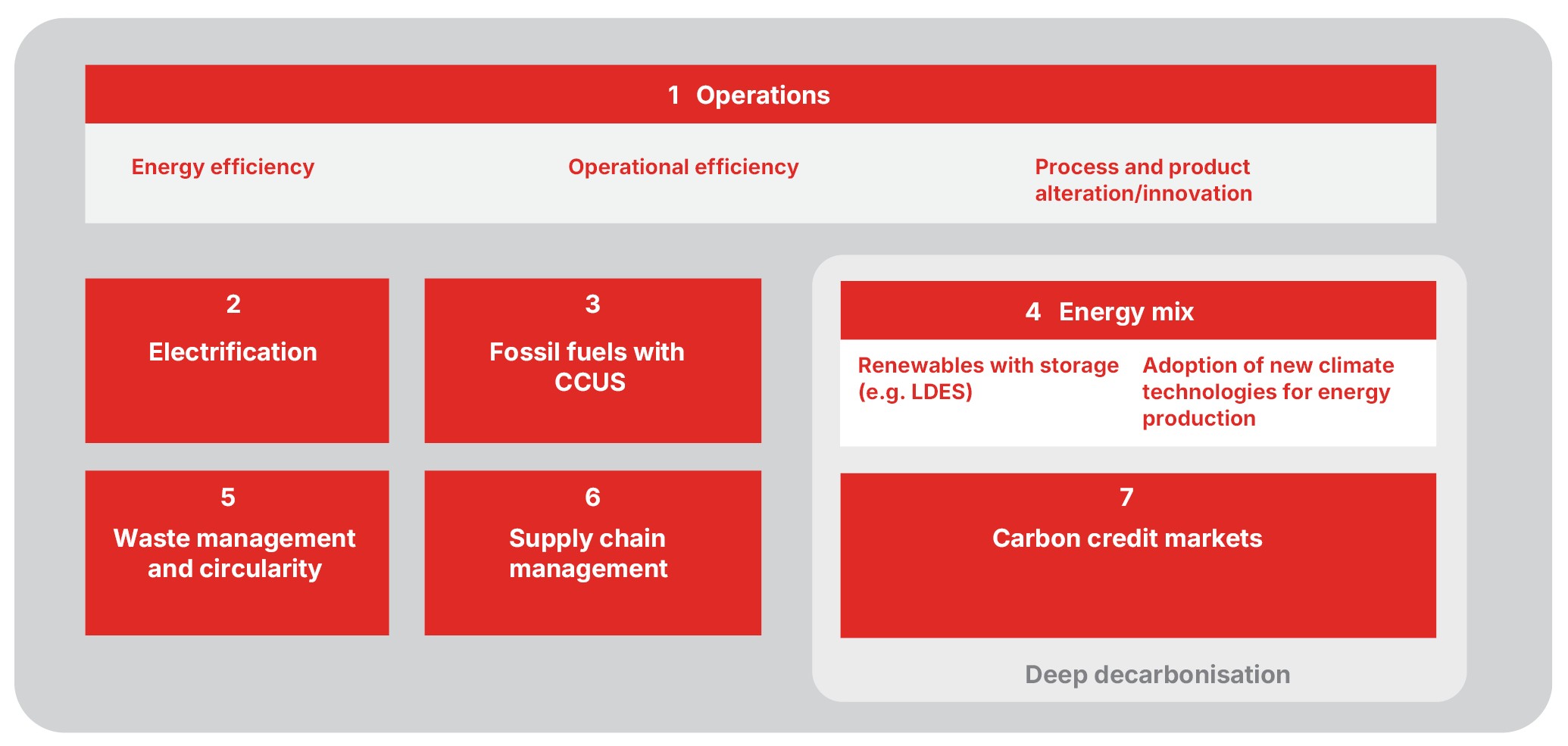 Decarbonisation across sectors is not uniform. Roundtable discussions and interviews with experts and platforms, representing the oil and gas, steel, cement, aviation, data-centre, and building industries, reveal a portfolio of strategies, deployed at different speeds depending on technological maturity, cost, and sector-specific constraints. These exchanges reveal seven strategic focus areas: Operations (e.g. operational and energy efficiency, process alteration/innovation), electrification, fossil fuels with CCUS, evolving energy mixes, waste management and circularity, supply chain management, and carbon market mechanisms (Figure 1).