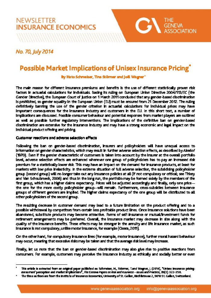 No. 70 , July 2014 Possible Market Implications of Unisex Insurance Pricing* By Hato Schmeiser, Tina St?rmer and Jo?l Wagner+ The main reason for different insurance premiums and benefits is the use of different statistically proven risk factors in actuarial calculations for individuals. Basing its ruling on European Union Directive 2004/113/EC (the Gender Directive), the European Court of Justice on 1 March 2011 concluded that any gender- based discrimination is prohibited, so gender equality in the European Union (EU) must be ensured from 21 December 2012. The ruling definitively banning the use of the gender criterion in actuarial calculations for individual prices may have important consequences for the insurance industry and customers in the EU. In this short text, a number of implications are discussed. Possible consumer behaviour and potential responses from market players are outlined as well as possible further regulatory interventions. The implications of the definitive ban on gender- based discrimination are extensive for the insurance industry and may have a strong economic and legal impact on the in dividual product offering and pricing. Customer reactions and adverse selection effects Following the ban on gender-based discrimination, insurers and policyholders will have unequal access to information on gender characteristics, which may result in further adverse selection effects, as described by Akerlof (1970). Even if the gender characteristic of customers is taken into account by the insurer at the overall portfolio level, adverse selection effects are enhanced whenever one group of policyholders ha s to pay an increased risk premium for a statistically lower risk. This may have an impact on the demand for insurance products, at least for markets with low price inelasticity. In the extreme situation of full adverse selection, the subsidising policyhol der group (second group) will no longer take out any insurance policies at all (if not compulsory or critical; see Thiery and Van Schoubroeck, 2006) and thus in the long run, the portfolio may be formed solely by the members of the first group, which has a higher claims expectancy. Prices will be adjusted accordingly and finally, only one price ? the one for the more costly policyholder group ?will remain. Furthermore, cross -subsidies between insurance groups of different genders are implied. The higher claims expectancy of the one group will be distributed to all other policyholders of the second group. The resulting decrease in customer demand may lead to a future limitation on the product offering and to a possible withdrawal by competitors from certain les s profitable product lines. Once insurance solutions have been abandoned, substitute products may become attractive. Forms of self -insurance or mutual/investment funds for retirement arrangements may be preferred. Overall, the insurance market may decrease in size along with the quality of the insurance benefits. These effects may be stronger in the annuity and life insurance market, as such insurance is not compulsory, unlike motor insurance, for example (Oxera, 2011). On the other hand, for compulsory ins urance lines (for example, motor insurance), further moral hazard behaviour may occur, meaning that excessive risks may be taken and that the average risk level may increase. Finally, let us note that the ban on gender -based discrimination may also give ri se to positive reactions from consumers. For example, customers may perceive the insurance industry as ethically and socially better or even * This article is extracted from an original paper published as: Schmeiser , H., St?rmer, T.and Wagner, J. (2014), ?Unisex insurance pricing: consumers? perception and market implications?, The Geneva Papers on Risk and insurance ? Issues and Practice, 39(3): 322 ?350. + The three authors are from the Institute of Insurance Economics, University of St. Gallen, Kirchlistrasse 2, 9010 St. Gallen, Switzerland.